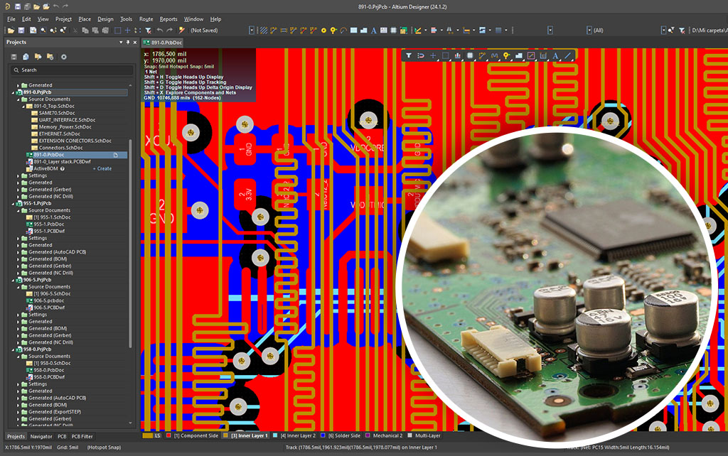 La creación de una placa de circuito impreso (PCB) con múltiples capas conductoras apiladas, optimizadas para manejar señales rápidas y minimizar interferencias electromagnéticas.